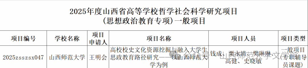 专职辅导员王明会申报项目《高校校史文化资源挖掘与融入大学生思政教育路径研究--以山西师范大学为例》成功获批一般项目。