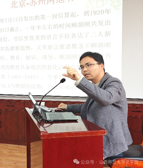 讲座从情感婚姻视角解读“新青年”顾颉刚与第二任妻子殷履安的关系,朱洪涛以1917至1920年间顾颉刚与殷履安的161封书信为核心线索,展开深入剖析。结合五四新文化运动的时代语境,他既清晰呈现了顾颉刚的婚姻观念,以及对妻子的启蒙实践;也深刻揭示了其理想与现实的内在矛盾——顾颉刚积极鼓励殷履安研读经典、追求新知,却未能充分顾及她的实际接受能力与情感需求。朱洪涛以私人情感为切入点,还原了历史人物的复杂面,为师生理解新文化运动时期的婚姻困境与女性处境提供了独特视角。此次讲座不仅丰富了师生们研究近代知识分子的思路,更提升了同学们运用多元史料、挖掘历史细节的能力,为后续学术研究奠定基础。